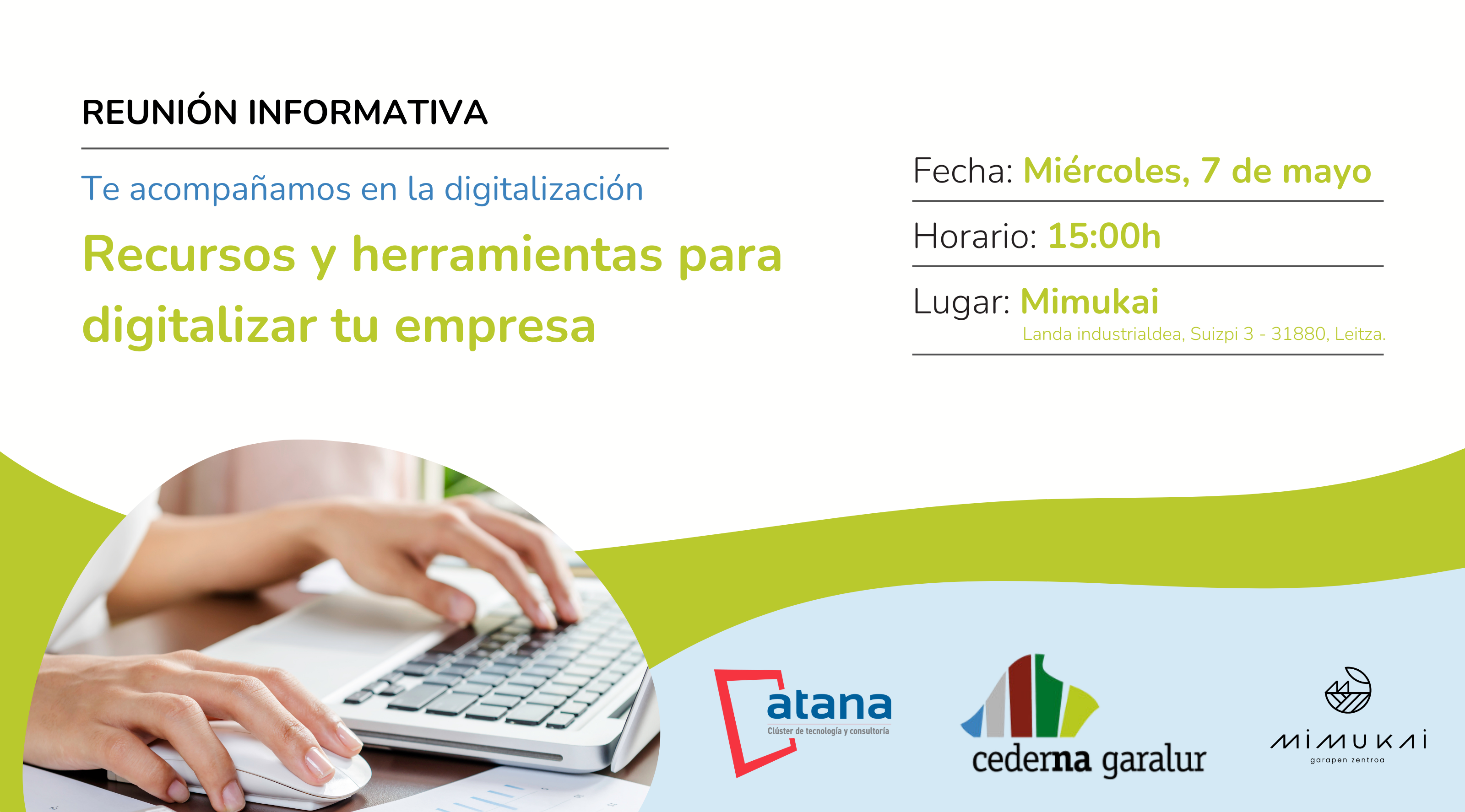 El próximo 7 de mayo, de la mano de Cederna Garalur y su proyecto Mimukai, ATANA impartirá una sesión informativa en el que expondrá recursos y herramientas para afrontar la digitalización, en todos sus ámbitos, de las empresas.