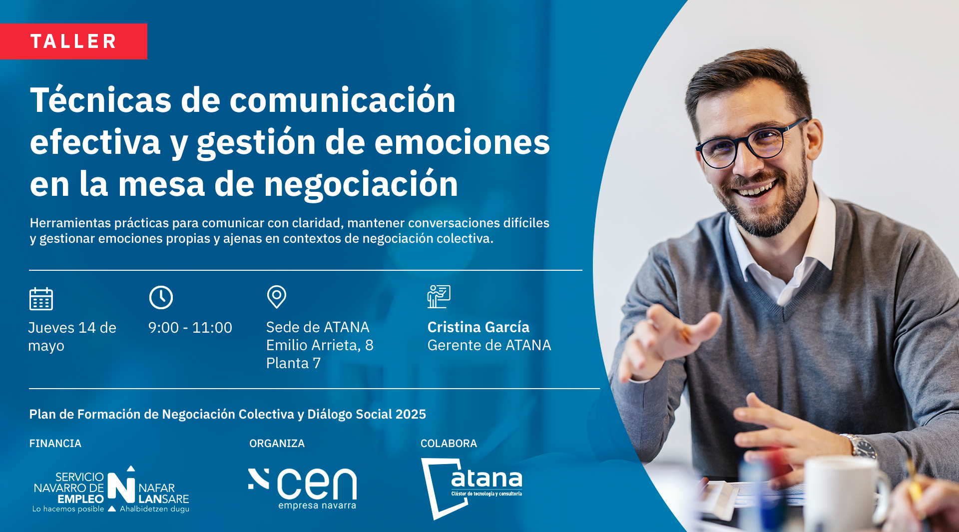 Taller impartido por ATANA, organizado por CEN y con la financiación del SNE-NLS que tiene el objetivo de dotar a las personas participantes de herramientas prácticas paracomunicar con claridad, mantener conversaciones difíciles y gestionar emociones propias yajenas en contextos de negociación colectiva.